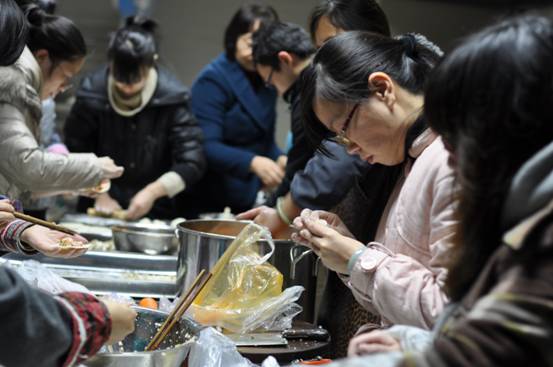 图七 为包饺子比赛中代表们正在认真包饺子 (陆军摄)