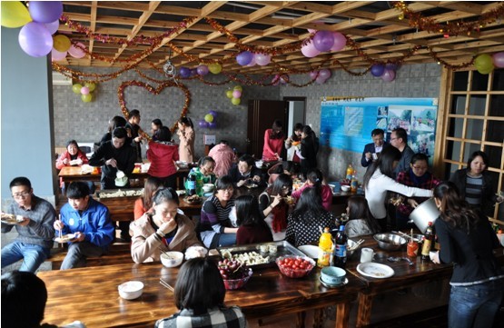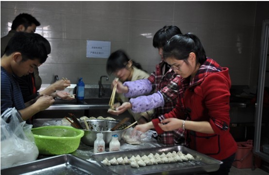 年会的第一部分是员工聚餐,为了切合年会的主旨,今天聚餐的主食——饺子,也是充满了年味。不到十点,各个部门的同事就来到11楼餐厅帮阿姨包饺子,大家各司其职,忙的不亦乐乎。细心的同事在厨房里洗菜,刀工了得的同事在案板上剁肉馅,还有别出心裁的同事用烤箱烤了美味的蛋糕,当然,更多的同事都在餐厅里包着饺子呢。一想到自己手里的饺子一会就要成为聚餐上的主角,大家都纷纷加快了动作。不到两个小时,阿姨买来的饺子皮就告罄了,上千只饺子被陆续放入蒸笼,最后成为了聚餐上的美食。看着大家满足的笑脸,参与活动的各位这才对自己的手艺松了口气,心情仿佛像打了一场胜仗般雀跃。